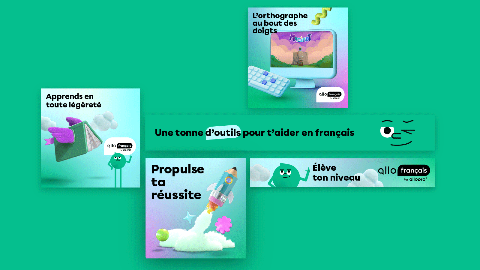 The creative approach aimed to distinguish Allofrançais within the Alloprof ecosystem while maintaining institutional coherence. The visual identity evolves the traditional 2D aesthetic into a dimension rich in volume and texture. This shift to 3D creates a playful and airy artistic direction, literally evoking growth and the building of self-confidence. Deployed through a national media strategy, this approachable campaign relies on a modular visual universe designed to resonate with diverse audiences. By combining strategic rigor with visual audacity, the project positions Allofrançais as an essential tool, aiming to support students over 5.5 million times this year and turn language mastery into a true driver of success.