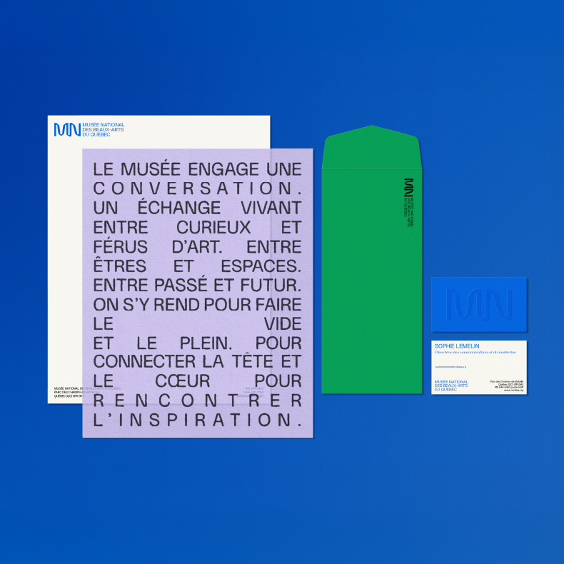 The concept draws inspiration from a universal gesture: the tilt of the head when contemplating a work of art. This movement of curiosity is translated into a visual identity inclined at 5°, featuring typography that blends sharp angles with fluid curves. The design expresses a duality between the formal structure of the institution and the inherent spontaneity of creation. Deeply rooted in its territory, the brand relies on a bold "MN" monogram and a color palette evoking the North and the natural beauty of the Plains of Abraham. More than a simple graphic refresh, this new identity serves as a catalyst for connection. It invites every visitor to take a second look, transforming the museum into a vibrant meeting place ready to shine on the world stage.