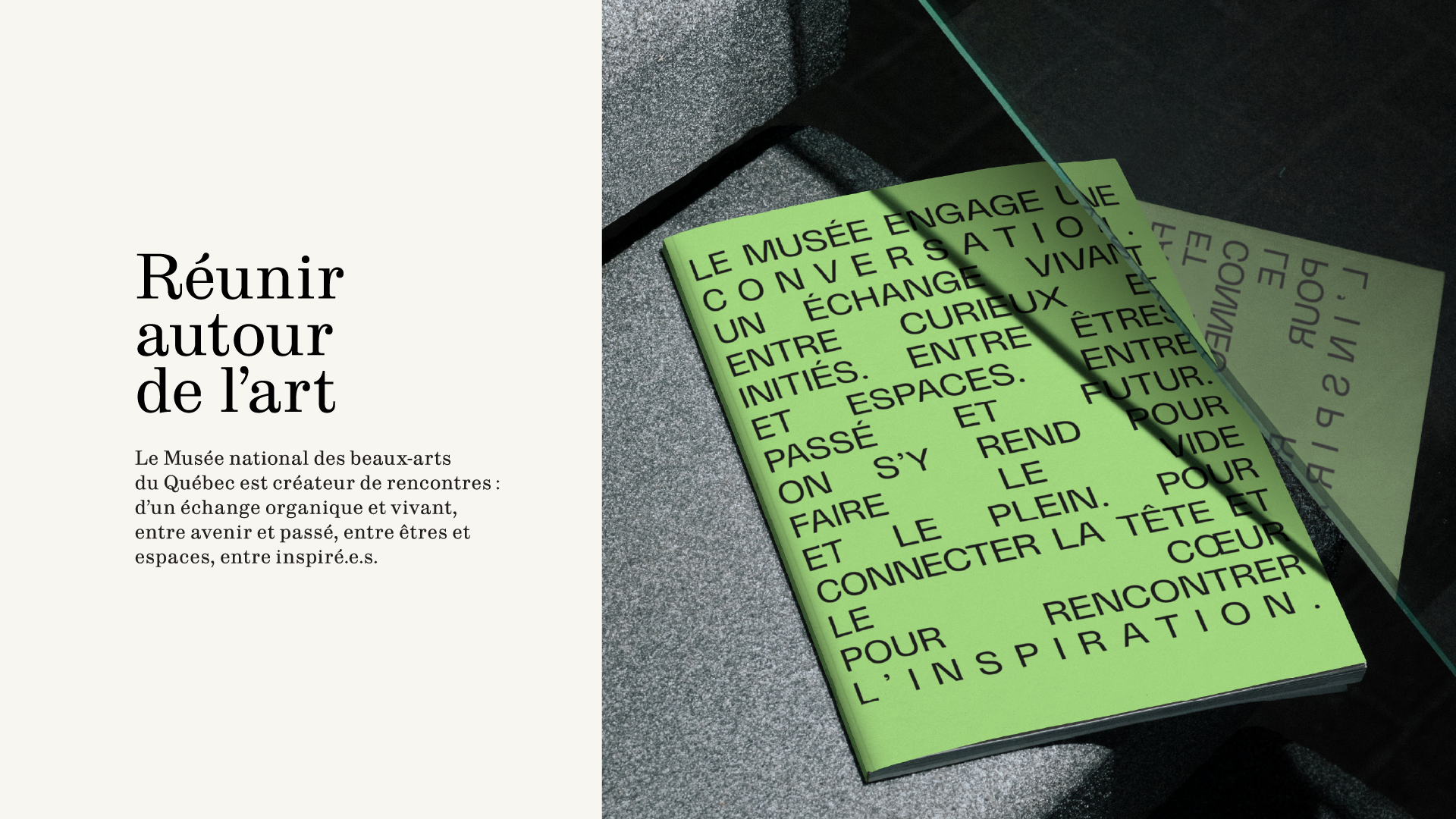 To mark the opening of the Riopelle Pavilion, the Musée national des beaux-arts du Québec (MNBAQ) is reinventing its image to embody a powerful vision: bringing people together through art. The challenge was to transform an institution once perceived as elitist into an organic and democratic space, while establishing a strong institutional signature capable of shining alongside its exhibitions.