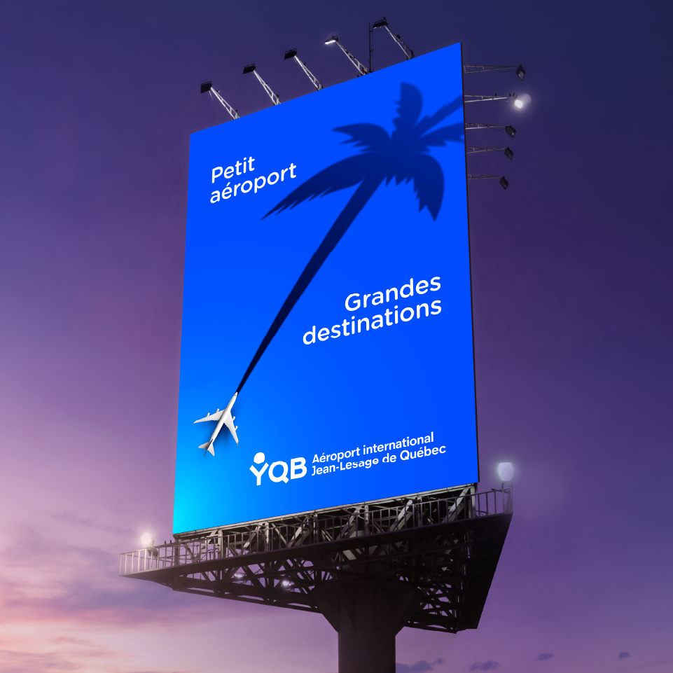 C’est ainsi que la campagne « Petit aéroport. Grandes destinations. » est née. Une initiative qui mise sur les petits plus de YQB pour inciter les voyageurs de la région à s’envoler au départ de Québec. Déployée à la télévision, en affichage et sur le web, l’offensive agit simultanément sur la notoriété de l’aéroport, la valorisation de ses avantages et la promotion de ses vols directs. Bref, une grande visibilité pour le plus petit des grands aéroports.